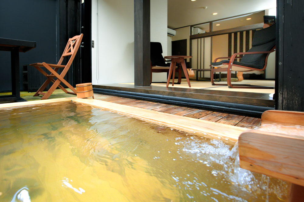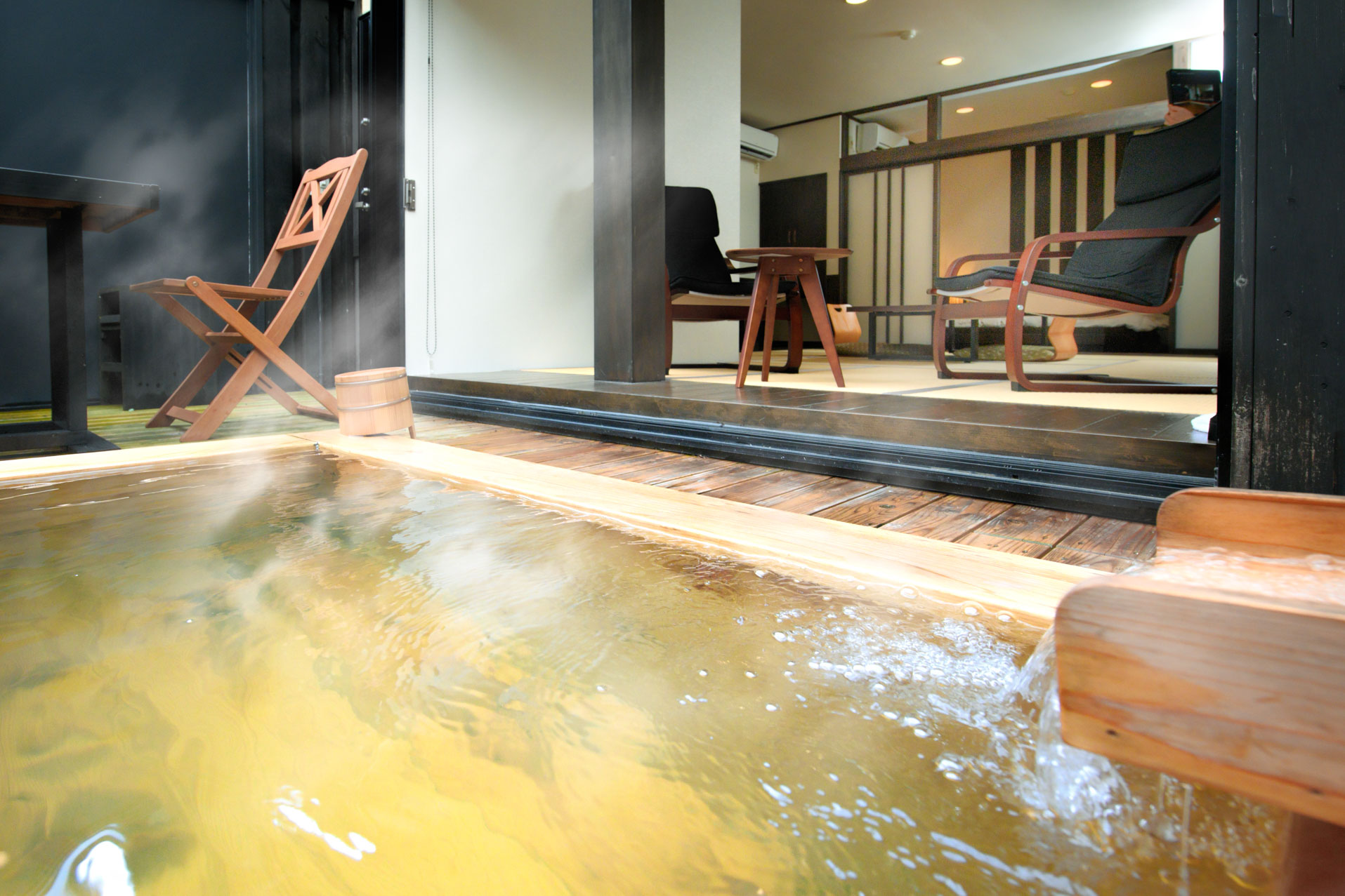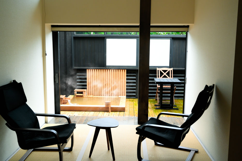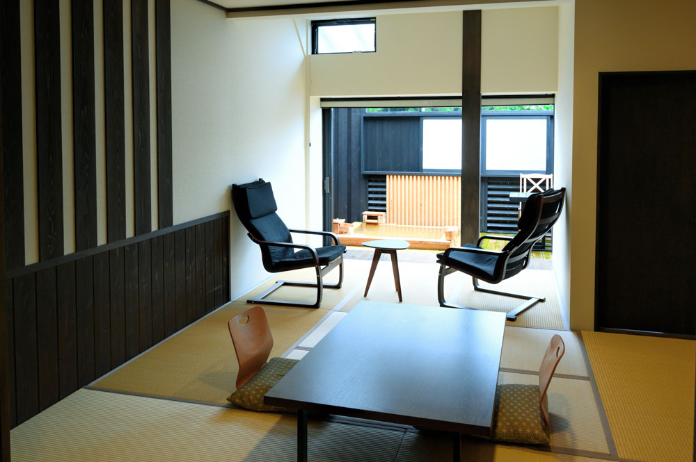 モダンな古民家テイストといった趣のお部屋です。窓際の広縁に置かれたチェアに腰掛け、ゆったりとおくつろぎくださいませ。