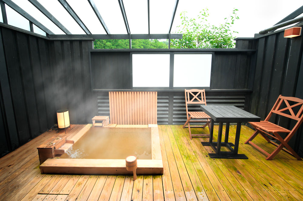 ウッドデッキ内には開放感たっぷりな檜づくりの露天風呂を設置しました。