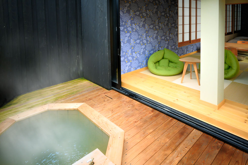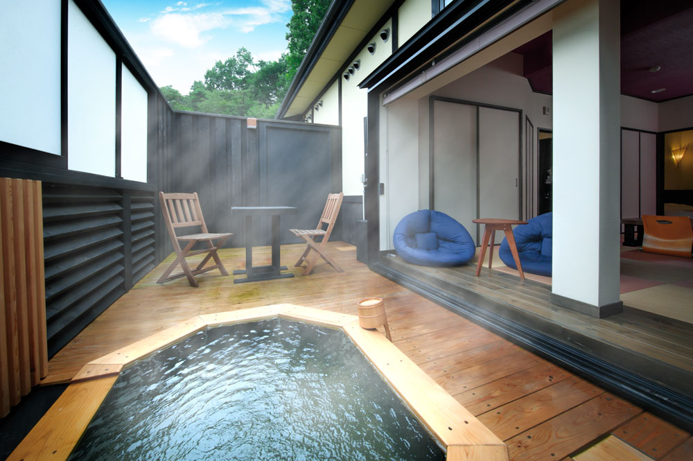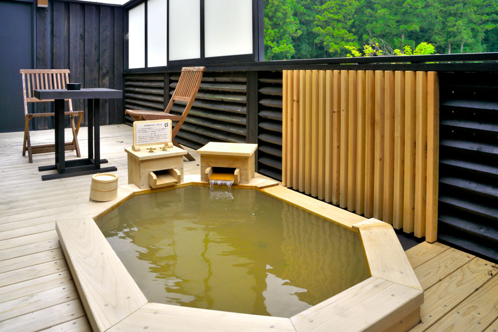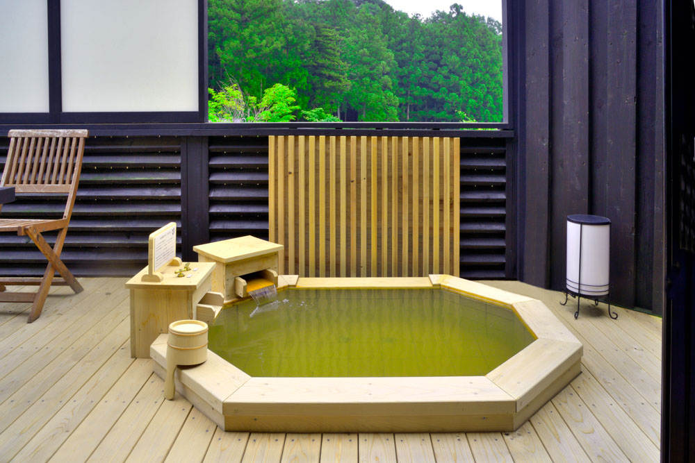 檜框の露天風呂。ウッドデッキではデッキチェアに腰掛けて木々を眺めるのもオススメです。
