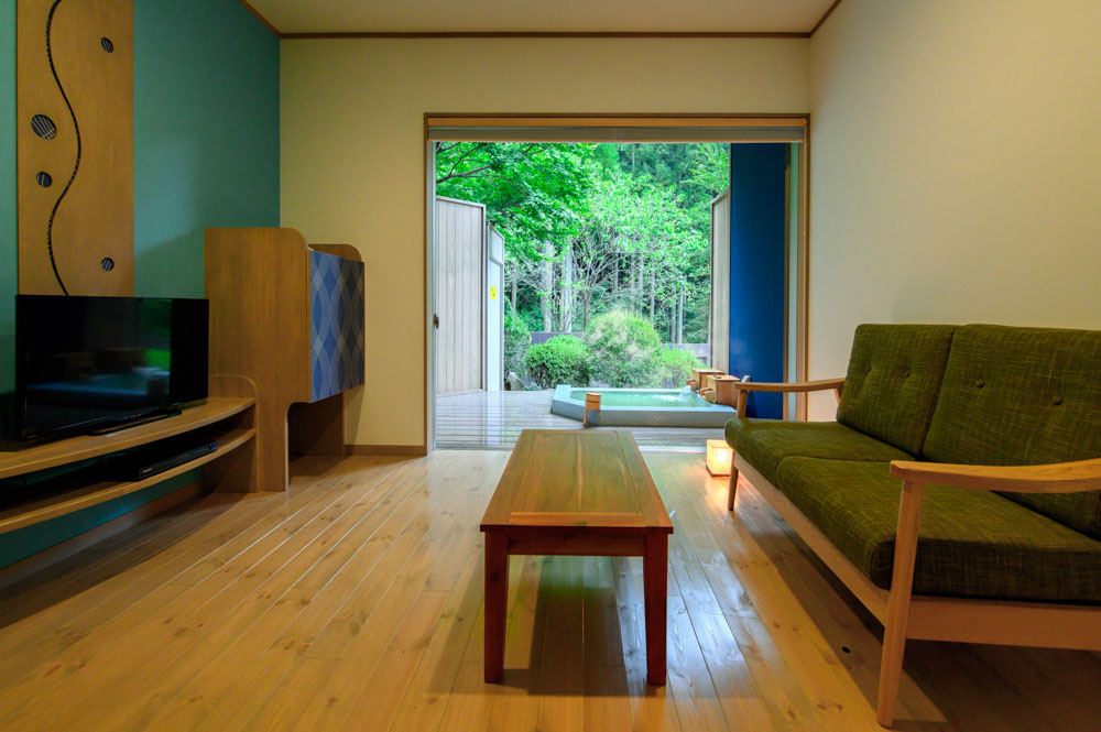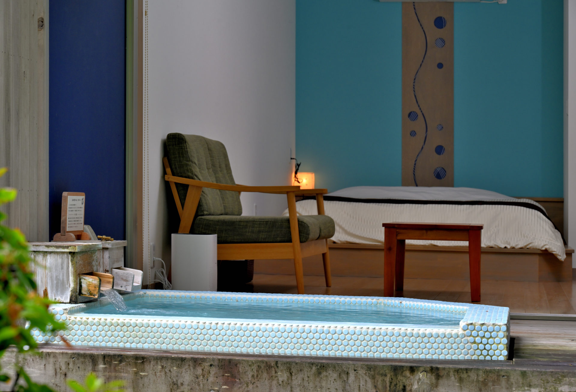 水浅葱 mizuasagi 別邸 月のせせらぎ。露天風呂付各室棟 和室 水浅葱の名の通り淡い水色をモチーフとした客室。 露天風呂 薄い水色のモザイクタイルで作られた、小川のせせらぎを間近に感じる露天風呂。 ご予約はこちら
