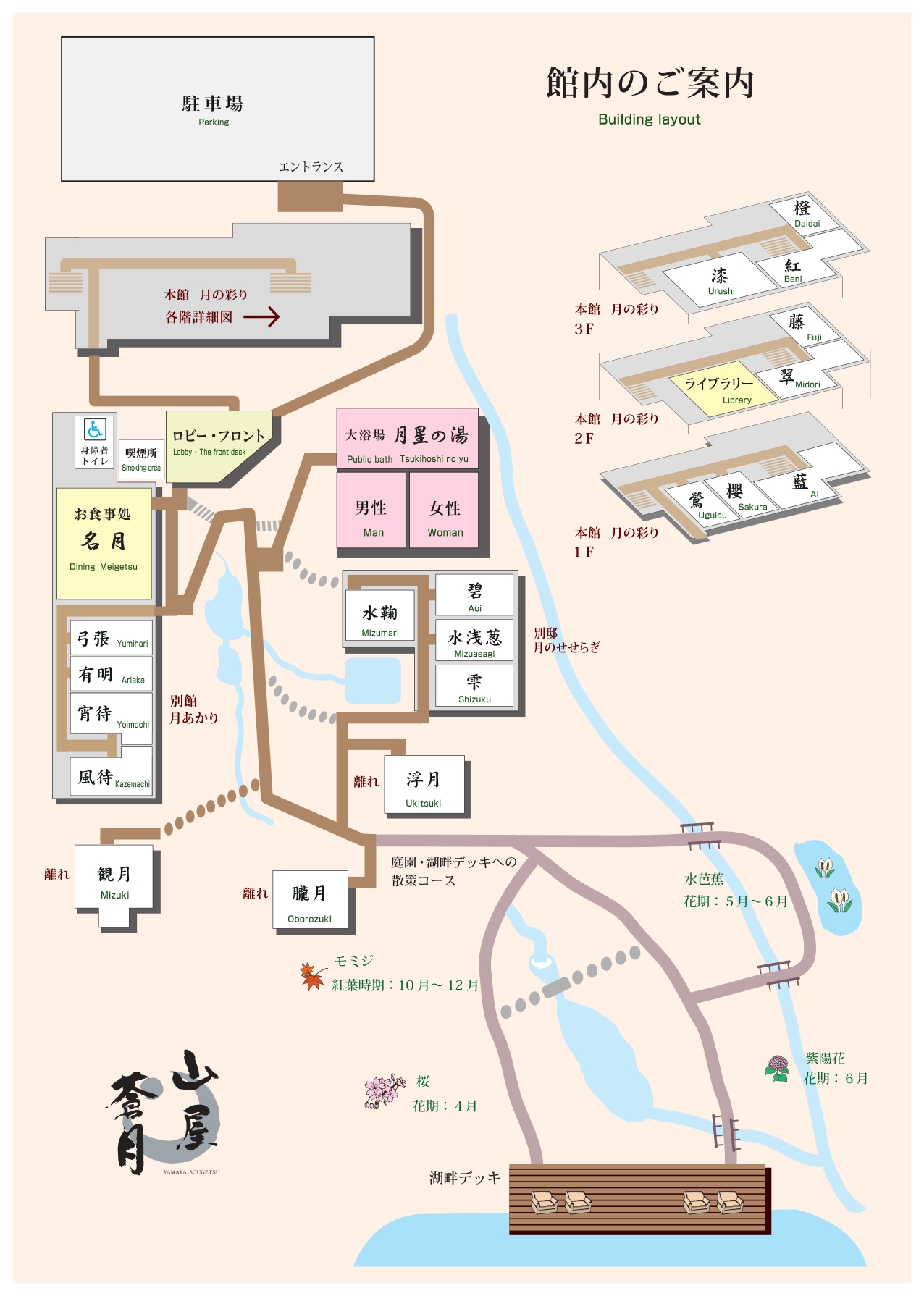 当館は、約五千坪の敷地を有してございます。敷地内には、庭園、森、池等があり、ご自由に散策いただけます。