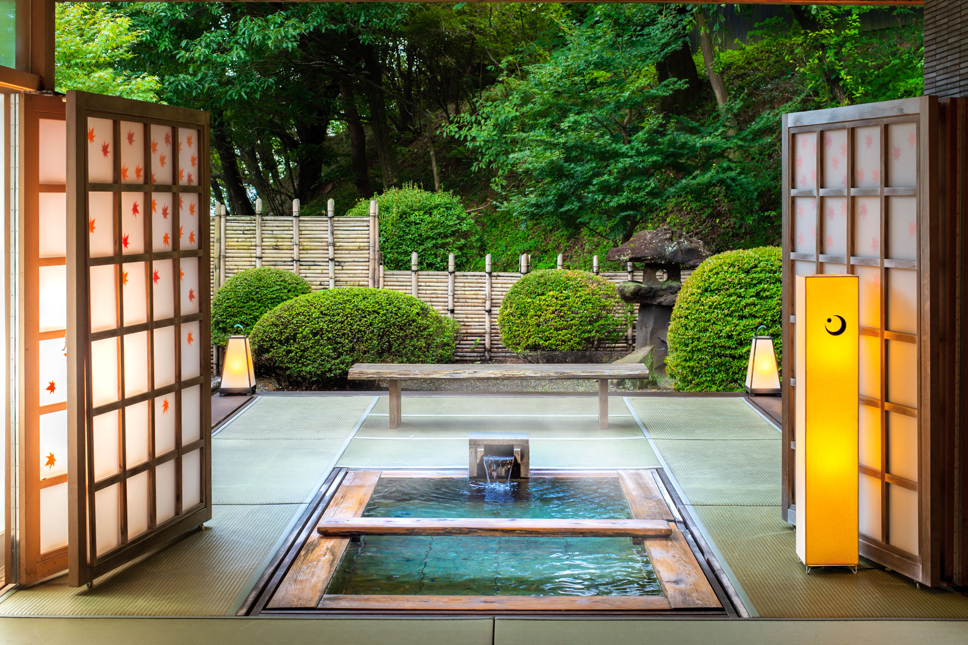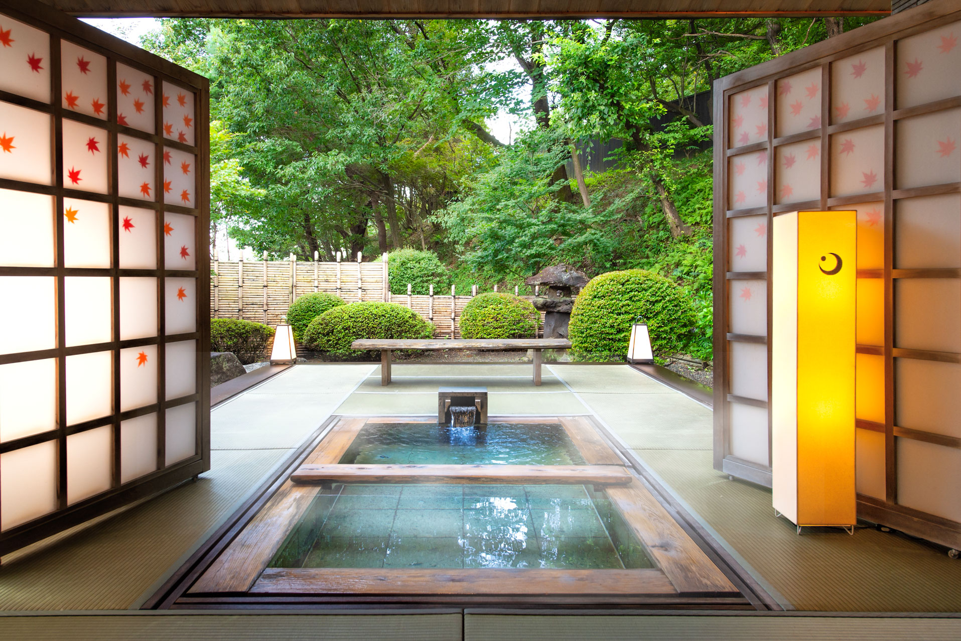 畳素材の床の露天風呂です。自由なレイアウトができる障子で閉鎖的な空間も演出できます。露天風呂には洗い場のある内風呂が併設されています。