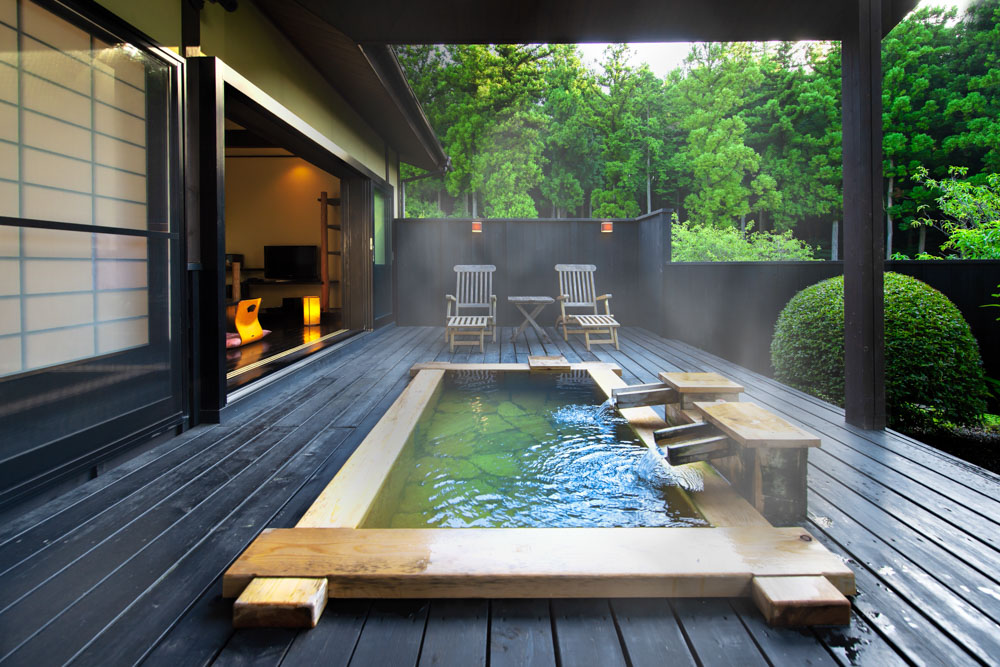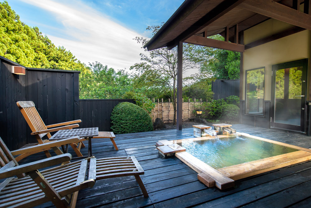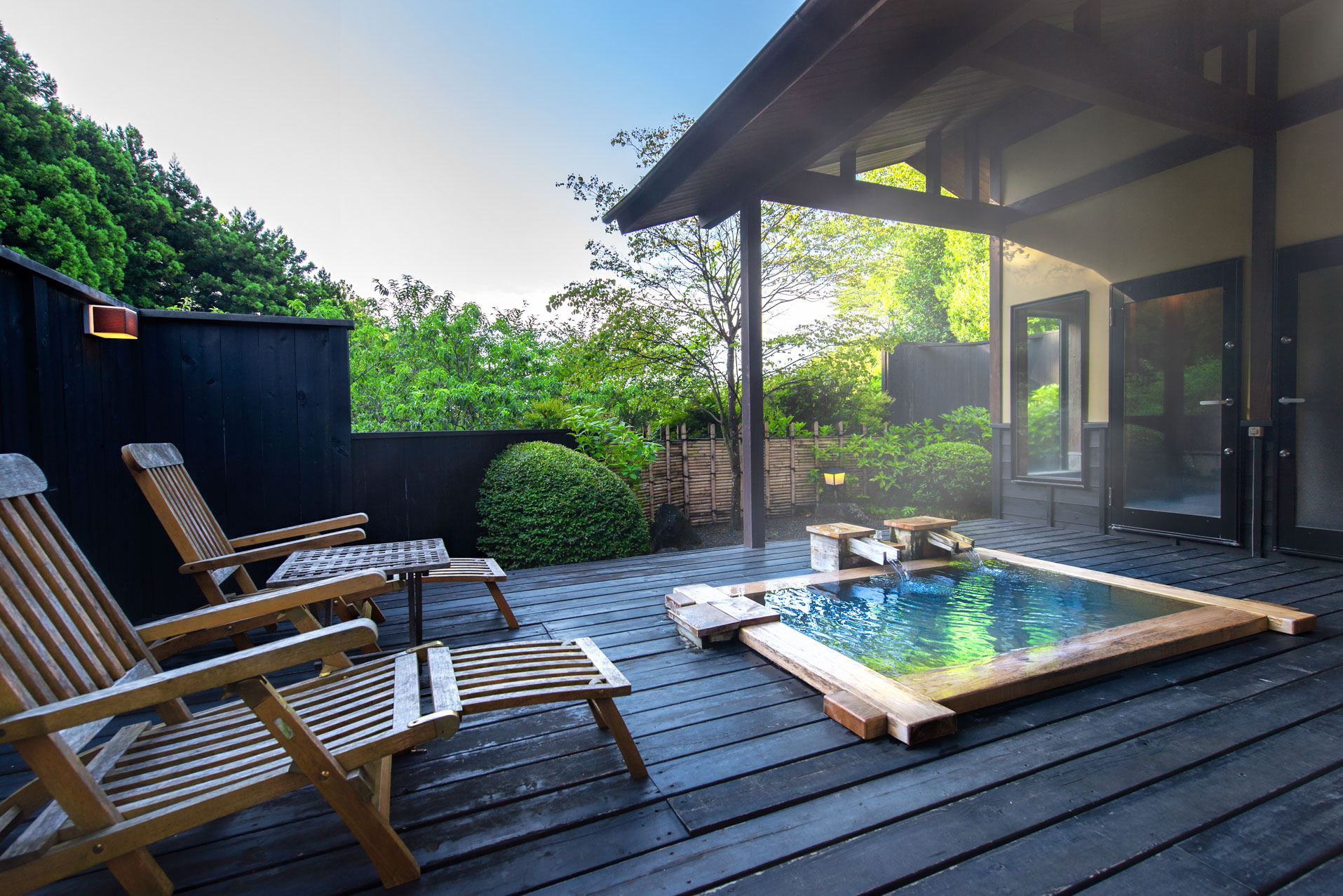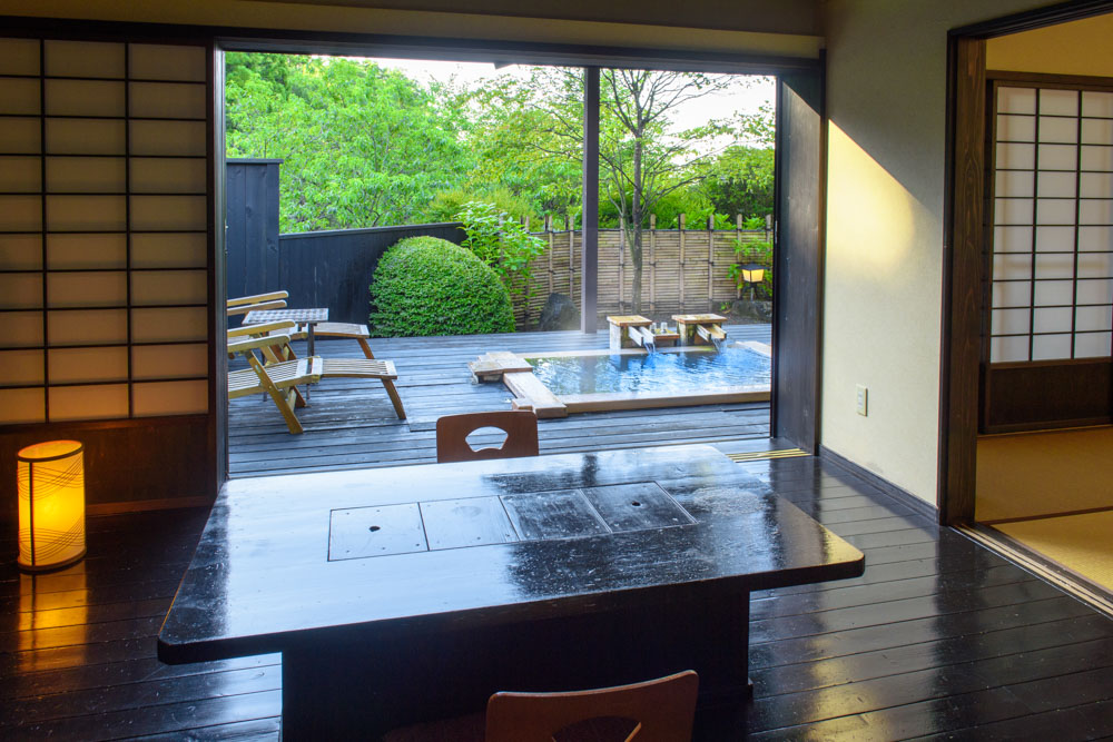 梁が掛かった天井、床暖房入りの居間、畳敷きの寝室を備え、広々としたウッドデッキや檜框の露天風呂を持つどこか懐かしい造りの離れでございます。